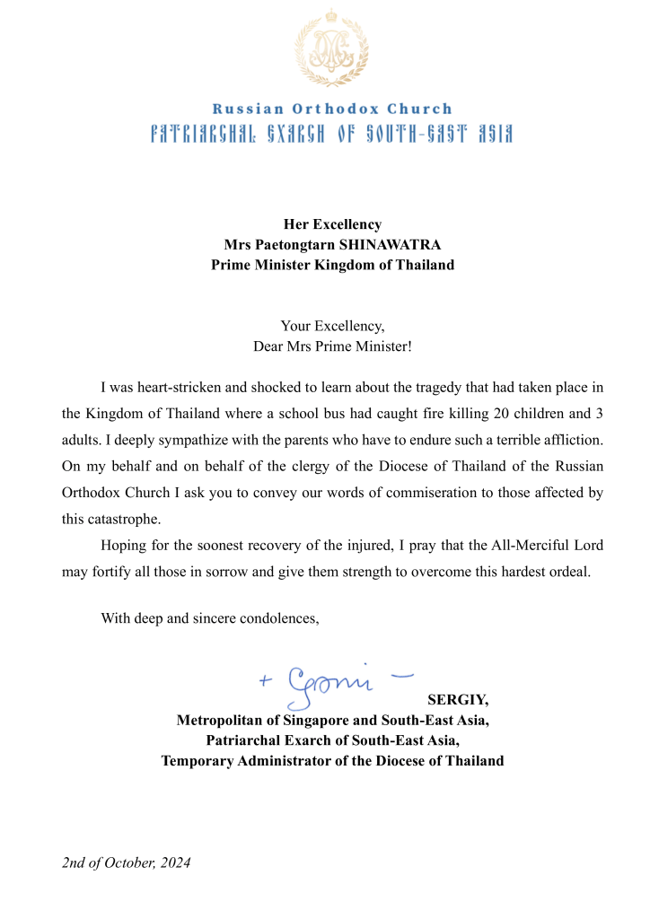 The Patriarchal Exarch of Southeast Asia, acting head of the Diocese of Thailand, Metropolitan SERGIUS of Singapore and Southeast Asia, sent a letter of condolences to the Prime Minister of Thailand.